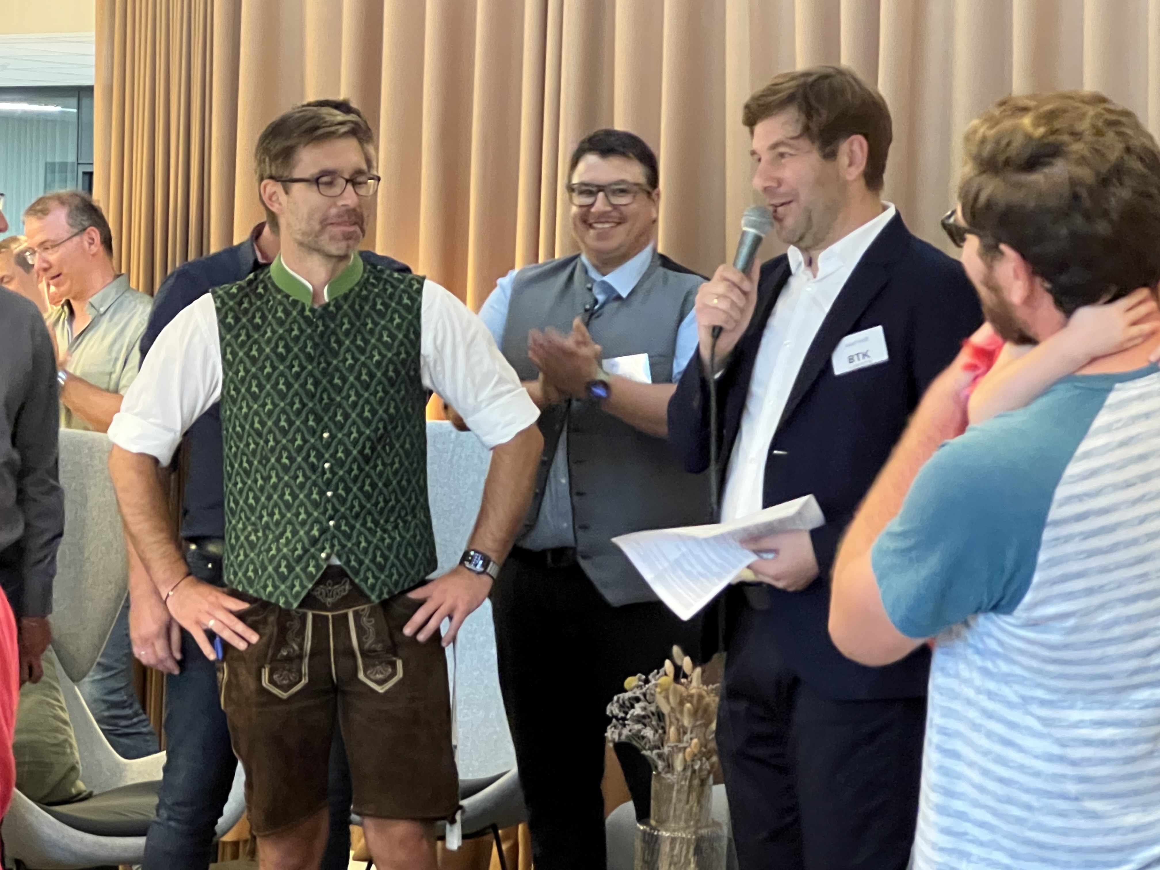 „Ursprünglich war der Küchen- und Aufenthaltsbereich geschlossen geplant“, erinnerte Josef Heiß in seiner Rede an einen massiven Einschnitt in der Planung. Die Idee, das Gebäude nach innen zu öffnen, kam vom Rosenheimer Planungsbüro für Innenarchitektur Zweiraumbüro, das die Gestaltung der Büroräume übernommen hatte. So entstand das moderne Work-Café, in dem mit Kunden gefeiert wurde und das heute die BTK im Inneren verbindet.