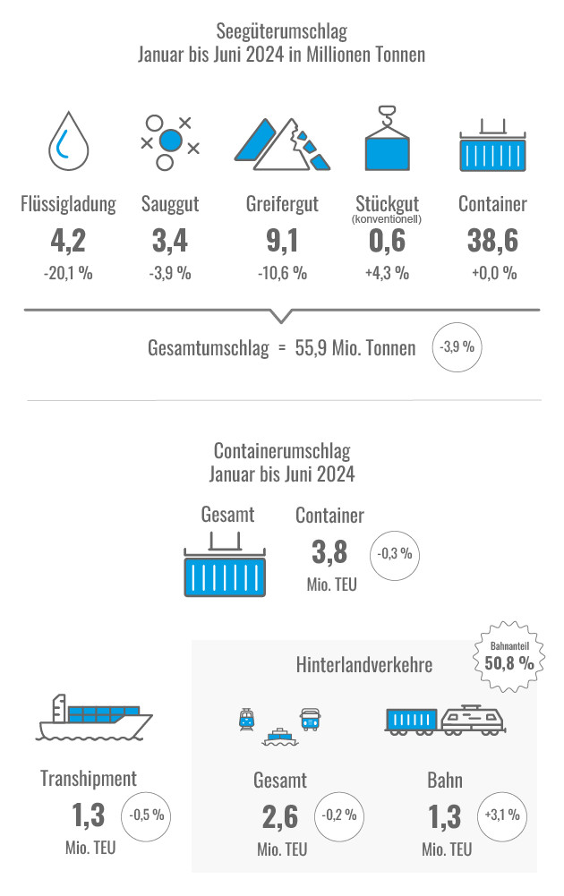 Positiv entwickelte sich in diesem Zeitraum der Umschlag beladener Container mit einem Plus von 0,5 Prozent auf 3,4 Millionen TEU. Der Umschlag konventioneller Stückgüter wies ebenfalls ein positives Ergebnis mit einem Plus von 4,3 Prozent und 585.000 Tonnen aus. Damit blieb die Gesamtzahl an umgeschlagenen Stückgütern mit 39,2 Millionen Tonnen (+/- 0,0 Prozent) stabil.